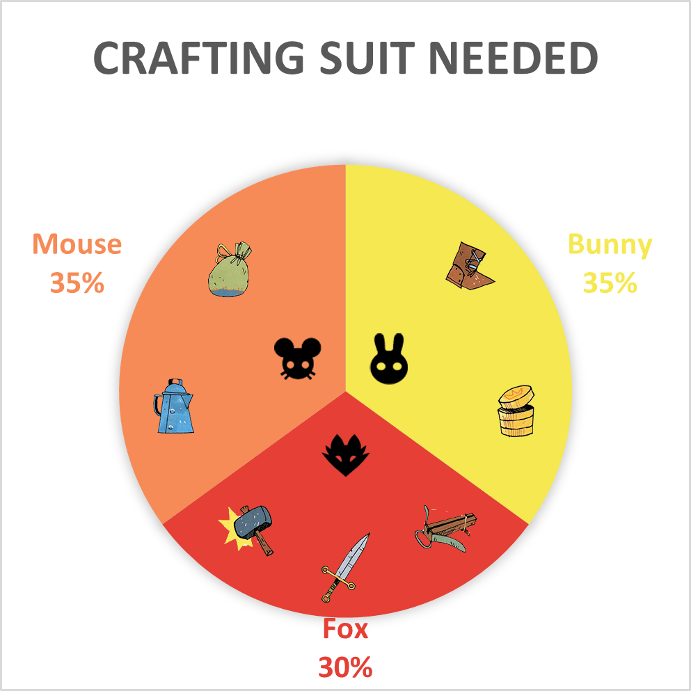 Even still, crafting all of the items available in the game would get 21 victory points which is nothing to sneeze at. If you had to devote yourself to one suit, I would devote to bunny. Bunny alone can get you 8 VP, while fox gets you 7 and mouse gets you 6.