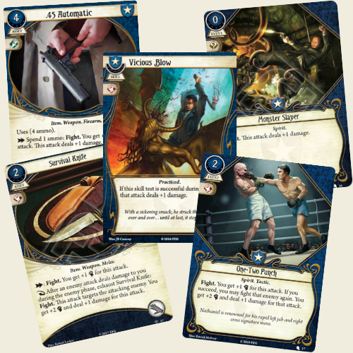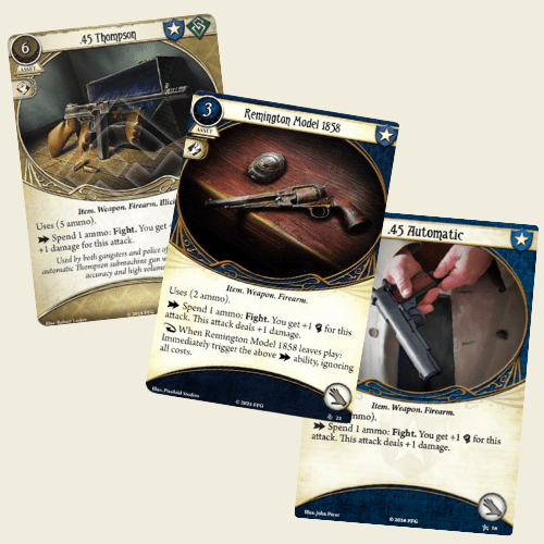 Guardians have two core types of weapons: melee and firearms. A lot of these cards have an action on them that allows the investigator to fight while adding a boost to combat or to the amount of damage being done or both.