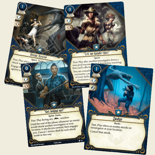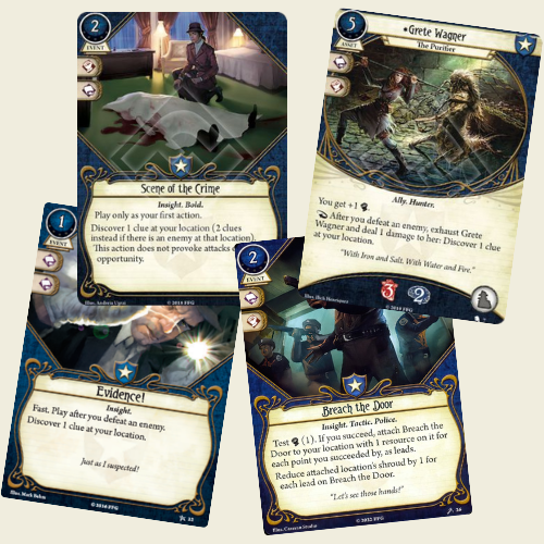Just because this class is all about fighting doesn’t mean they have no investigating capabilities. They have, like, two? Okay, there are a bit more than that but it’s still low. What’s interesting is they will get clues from fighting or as a side effect of doing another action. Not to say these cards are good, just to know that they are there.